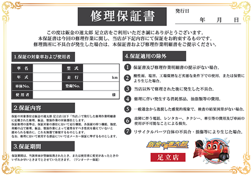 当社で鈑金修理・塗装した箇所に万が一塗装剥がれ等があった場合、お客様がそのお車に乗り続けている限り無料で再補修させていただきます。 ※部品等はメーカーの補償範囲に準じます。 ※保証期間は、当該車両が登録抹消されたとき又は使用者に変更があったいずれか早い時といたします。(ワンオーナー保証)